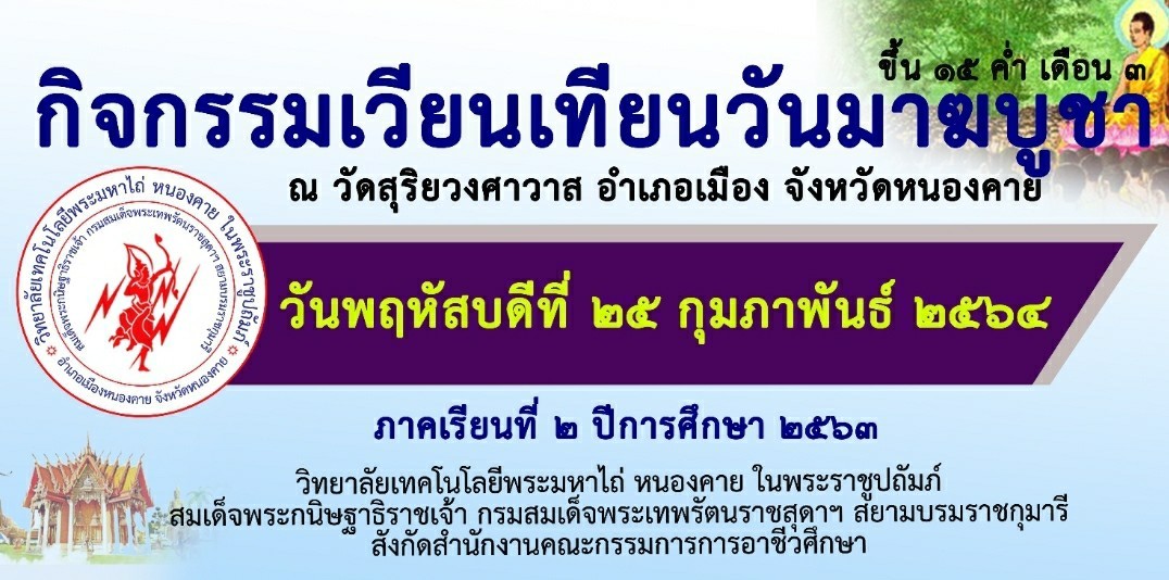 วันพฤหัสบดีที่ ๒๕ กุมภาพันธ์ ๒๕๖๔ คณะครู บุคลากรและนักเรียนนักศึกษาวิทยาลัยเทคโนโลยีพระมหาไถ่ หนองคาย ในพระราชูปถัมภ์ฯ ร่วมทำบุญและเวียนเทียนเนื่องในวันมาฆบูชา ประจำปี ๒๕๖๔ ณ วัดสุริยวงศาวาส อำเภอเมืองหนองคาย จังหวัดหนองคาย